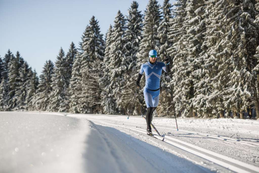 Beim Langlaufen kommt man schnell ins Schwitzen, deshalb ist die richtige Kleidung entscheidend. Ideal ist das Zwiebelschalenprinzip: eine atmungsaktive Funktionsunterwäsche, darüber eine leichte Isolationsschicht und außen eine windabweisende, aber luftdurchlässige Jacke. So kann man je nach Temperatur oder Anstrengung unkompliziert eine Schicht ausziehen oder wieder anlegen. Zu dicke Kleidung führt hingegen schnell zu Überhitzung und nimmt dem Sport die Leichtigkeit.
